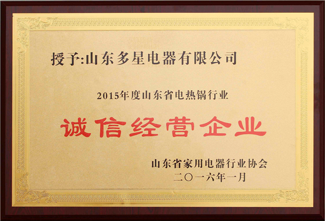2015年度山東省電熱鍋行業(yè)“誠信經(jīng)營企業(yè)”