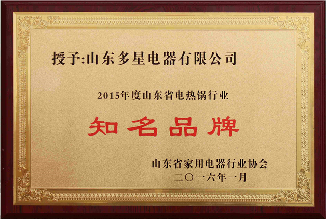 2015年度山東省電熱鍋行業(yè)“知名品牌”